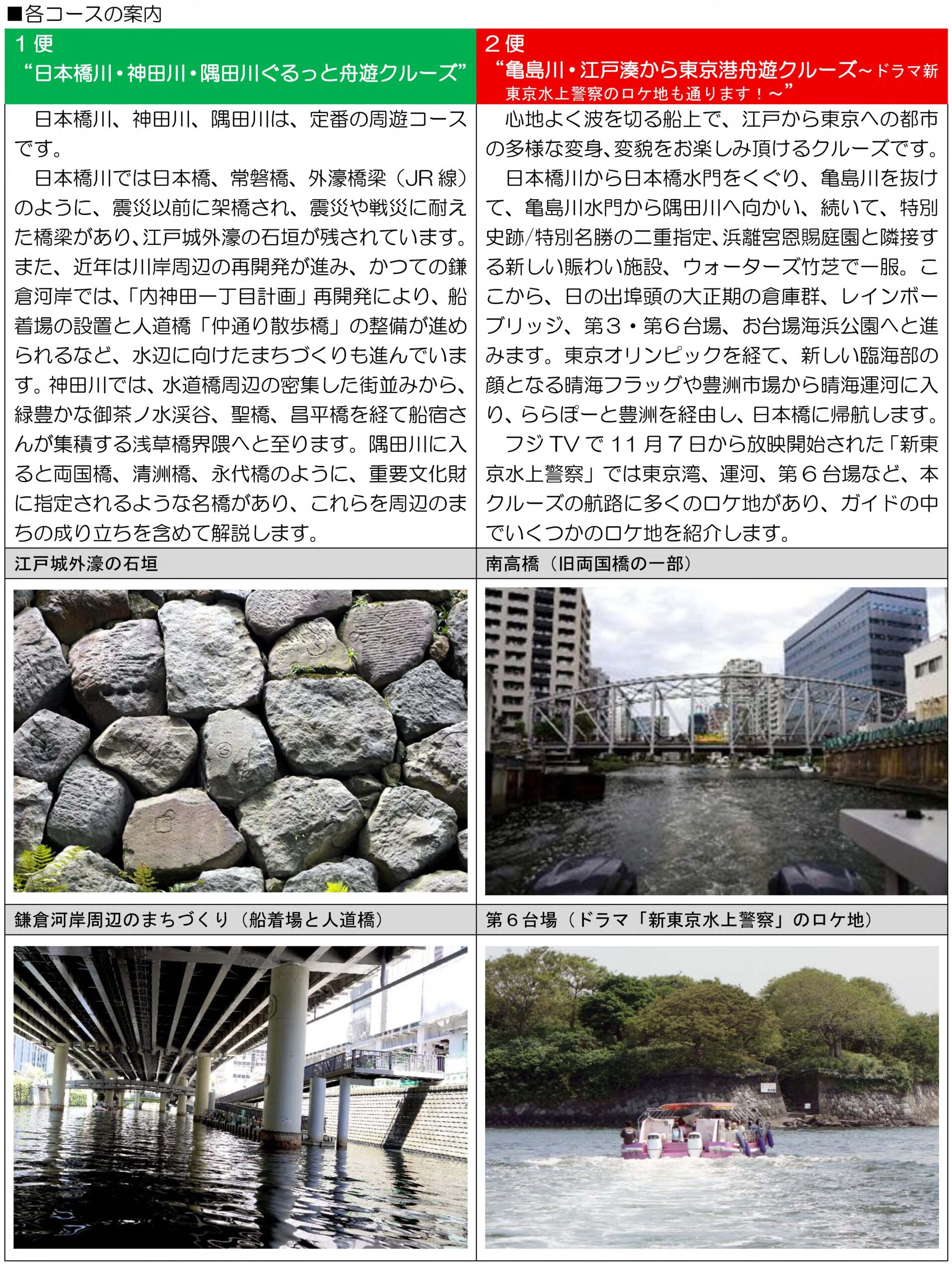 1便は、“日本橋川・神田川・隅田川ぐるっと舟遊クルーズ”、2便は“東京港舟遊クルーズ~~ドラマ新東京水上警察のロケ地も通ります!~”の2つのクルーズをお楽しみ頂けます。本会の習熟したガイドが各人の個性豊かにご案内します。皆様のふるっての御参加を、宜しくお願い致します。