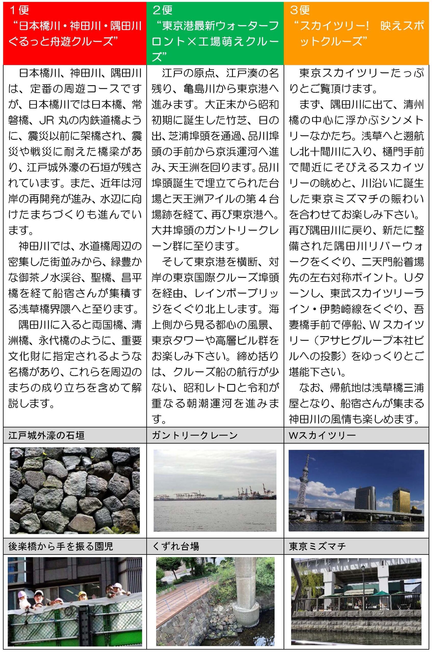 1便は、“日本橋川・神田川・隅田川ぐるっと舟遊クルーズ”、2便は“東京港最新ウォーターフロント×工場萌えクルーズ”、3便は“スカイツリー! 映えスポットクルーズ”をお楽しみ頂きます。本会の習熟したガイドが、このクルーズをご案内します。皆様のふるっての御参加を、宜しくお願い致します。