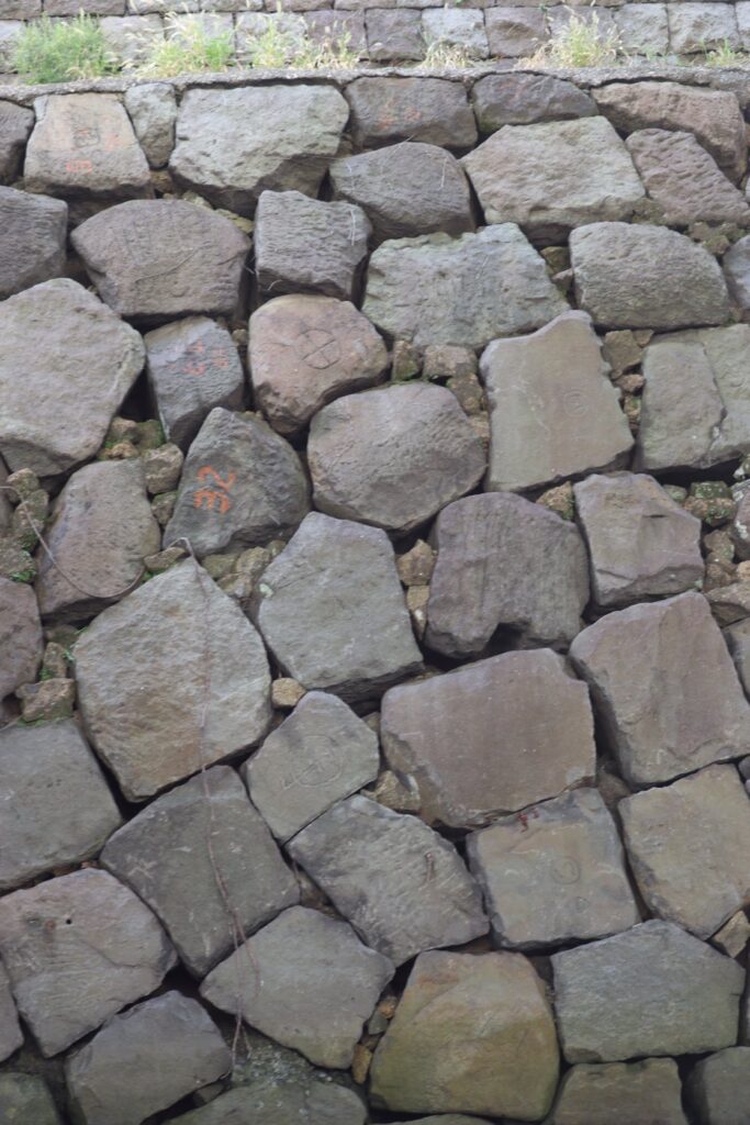 江戸城の石垣を見ながら日本橋川を北上していきます。望遠レンズで撮影すると石垣の刻印も見ることができます。