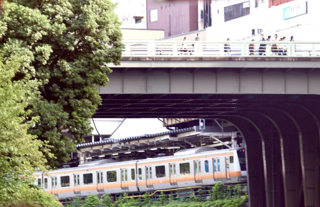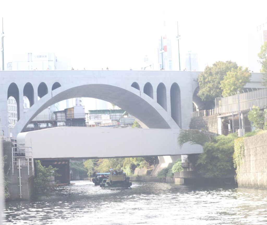 神田川を東に進んでいる間、中央線と並走する区間があります。これは御茶ノ水駅に中央線が停まっている写真です。実は職場の近くなのですが、このアングルから御茶ノ水駅を見たことはなかったので新鮮でした。