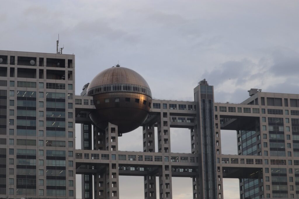 フジテレビの球体、夕暮れ時の写真です。
