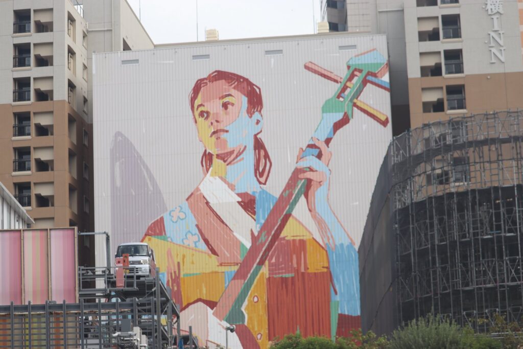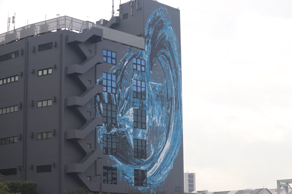 この壁画、何というのだろうと調べてみたら、現代アーティスト山口歴 氏が描いた「OUT OF BOUNDS」という作品で、描かれているビルは寺田倉庫T33ビルのようです。